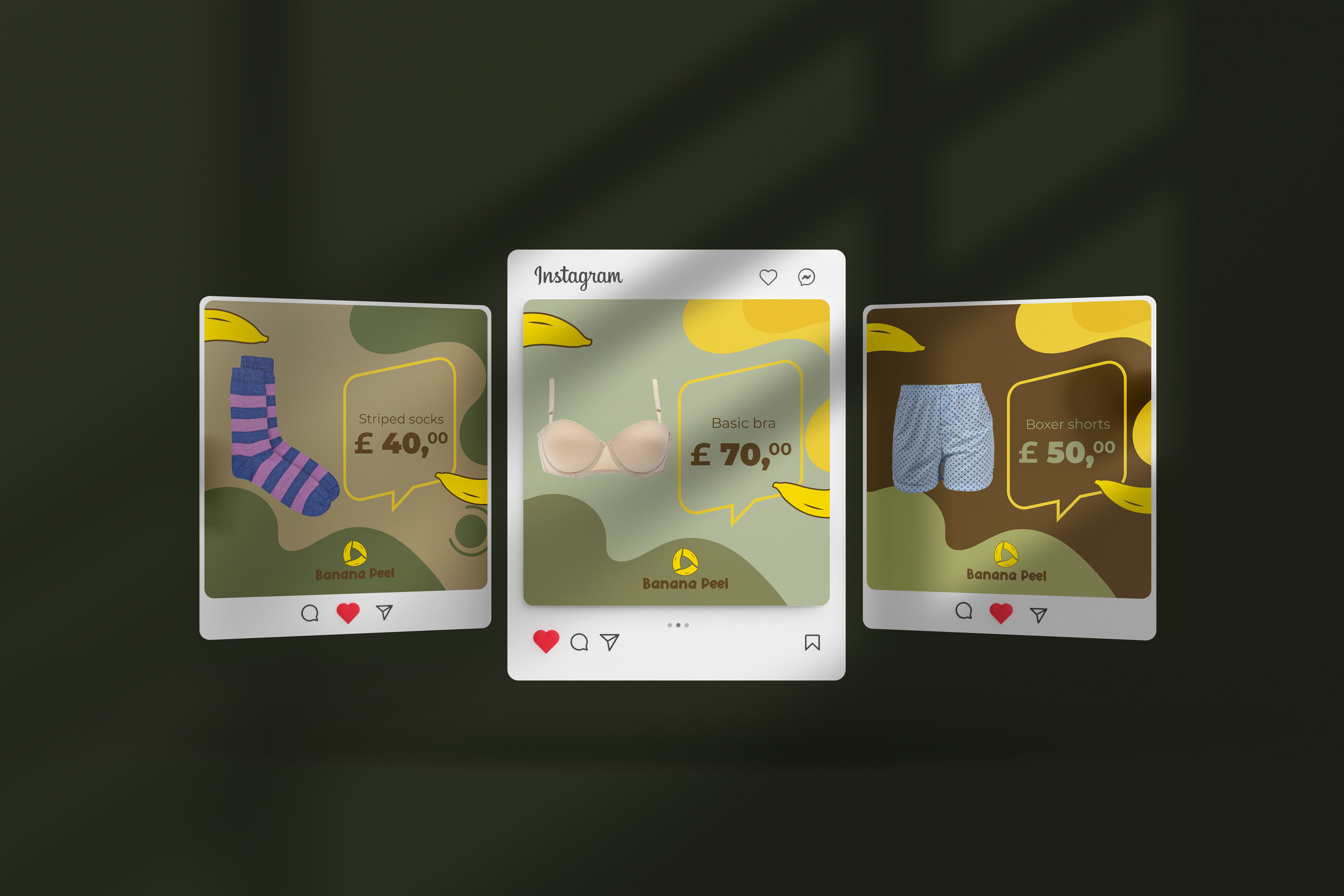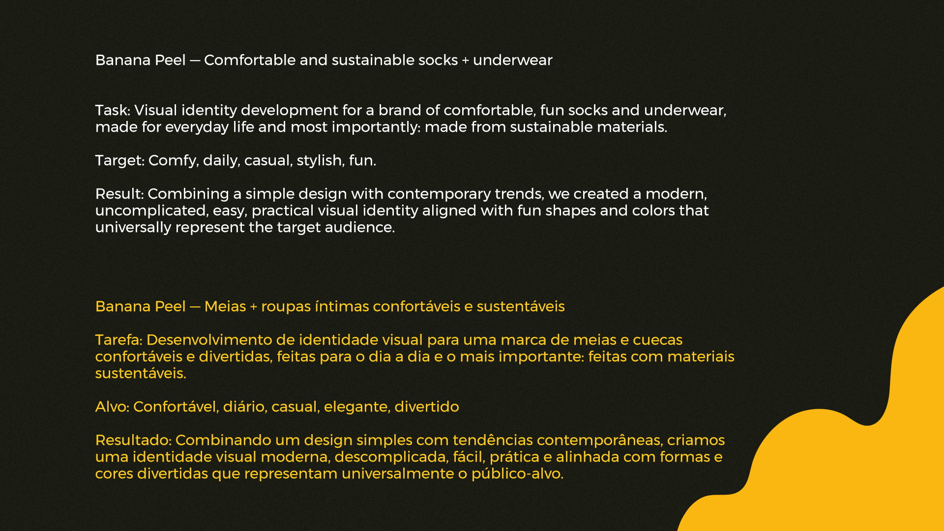 O case Banana Peel evidencia minha capacidade de criar marcas com propósito — unindo direção de arte, estética, consciência sustentável e posicionamento estratégico. A marca representa mais do que meias ou underwear: representa valores, estilo de vida e identidade visual coerente. Esse projeto mostra que posso desenvolver marcas completas e contemporâneas, prontas para dialogar com o mundo atual: sem gênero, consciente, estética e emocionalmente forte.
