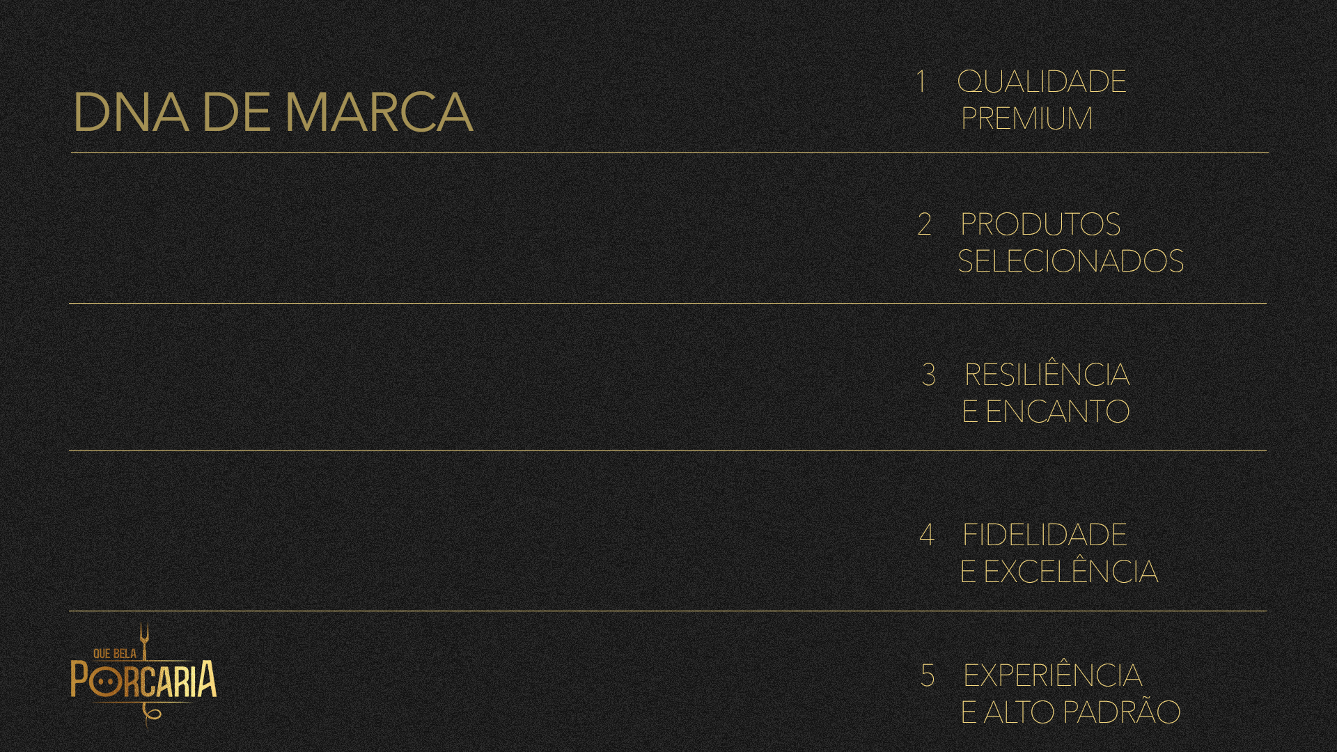 Projeto realizado para o cliente Que Bela Porcaria, com o objetivo de construir uma marca que traduzisse sofisticação, qualidade e diferencial de produto — mesmo lidando com um tipo de alimento naturalmente associado ao popular e tradicional.